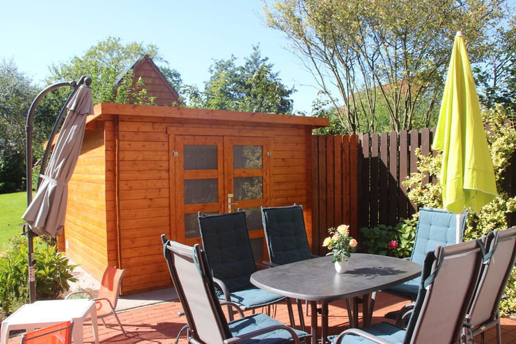 - Terrassenmöbel, wie ein Tisch, Stühle und Liegen
